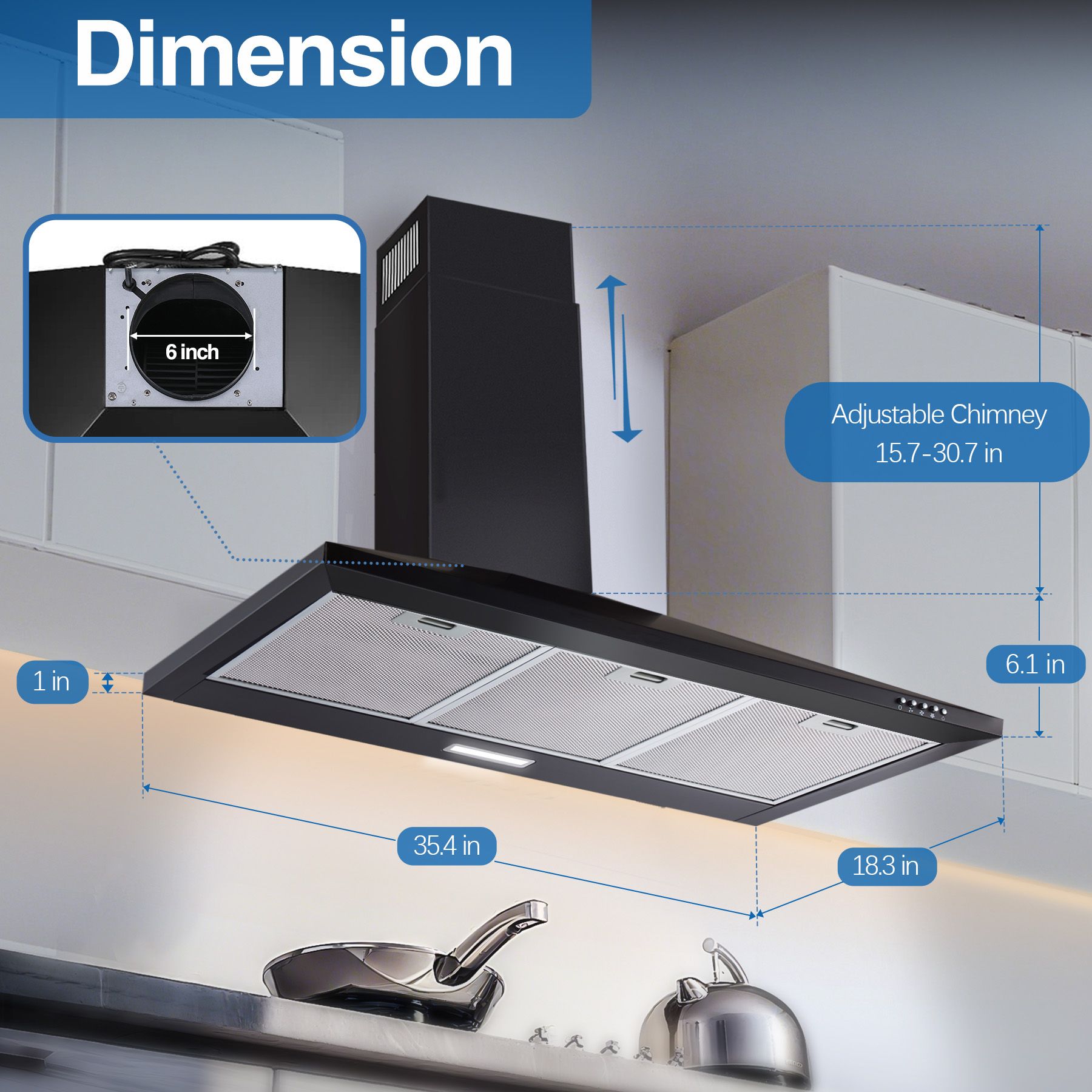 [Chimney-style Wall Mount Range Hood]Product Dimensions: 35.4 in. (W) x 18.3 in. (D) x Adjustable 22.8 in. - 37.8 in. (H). 120V/60Hz, 3-prong plug. range hoods provide 1-month manufacturer warranty together with your purchase. If you have any questions, please feel free to contact us.