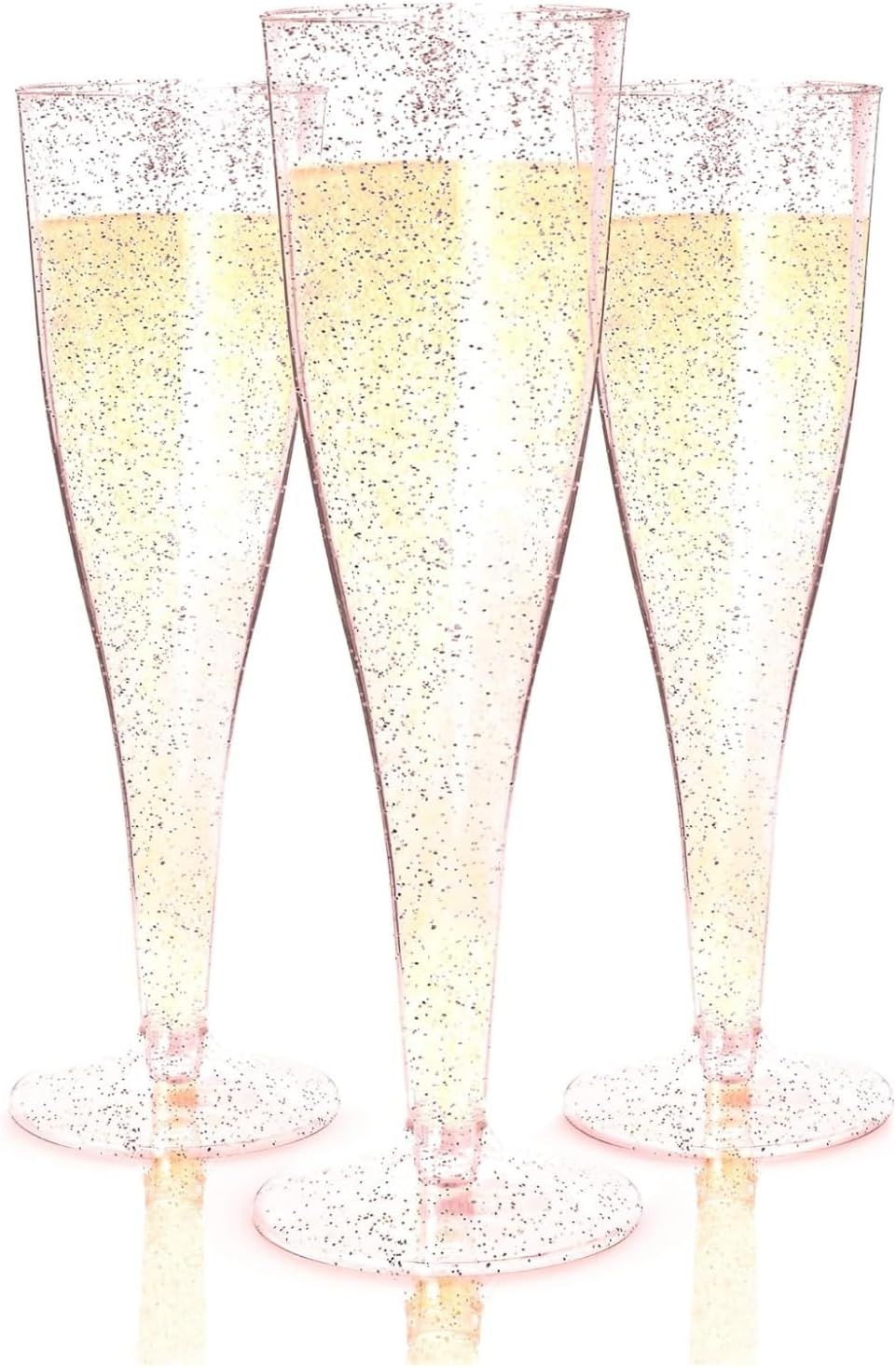 24 Piece Plastic Champagne Flutes Plastic Wine Glasses with Rose Gold Glitter - Cocktail Glasses for Parties - Party Supplies for Mimosa Bar, Wedding, Shower Party and New Years Eve