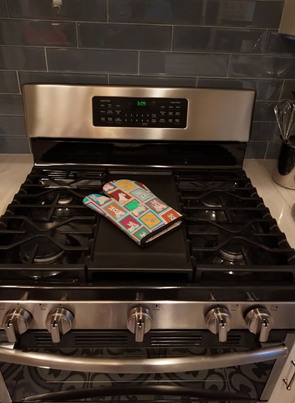 Oven Mitt featuring breed specific Schnauzer artwork. Presenting our Large Right Hand Thick Heat Resistant Oven Mitt, an indispensable tool for any culinary enthusiast. This mitt boasts layers of quilted protection on both sides, providing outstanding resistance against extreme heat. Embellished with beautifully printed artwork, it adds an extra dash of charm to your kitchen decor. At about 12 inches long and 8 1/2 inches wide, this oven mitt offers a generous fit, accommodating a diverse range of hand sizes. Its design is enhanced by a sleek Black bias tape trim, finished with a convenient hoop for easy hanging. Fresh out of the packaging, the quilting process may give the mitt a stiff feel, but rest assured, it will soften with use and washing. Our mitt is crafted with a unique center fabric, Insul-Bright, a composite material made from polyester fibers, needle-punched through a nonwoven substrate and a reflective metallized film. This smart material resists both conduction and radiant energy, reflecting heat back to its source, all while remaining breathable. Our oven mitt is machine washable and safe for tumble drying. It's a perfect gift for your favorite Chef, BBQ enthusiast, or just a little treat for yourself! Experience safety, style, and convenience rolled into one with this exceptional oven mitt.