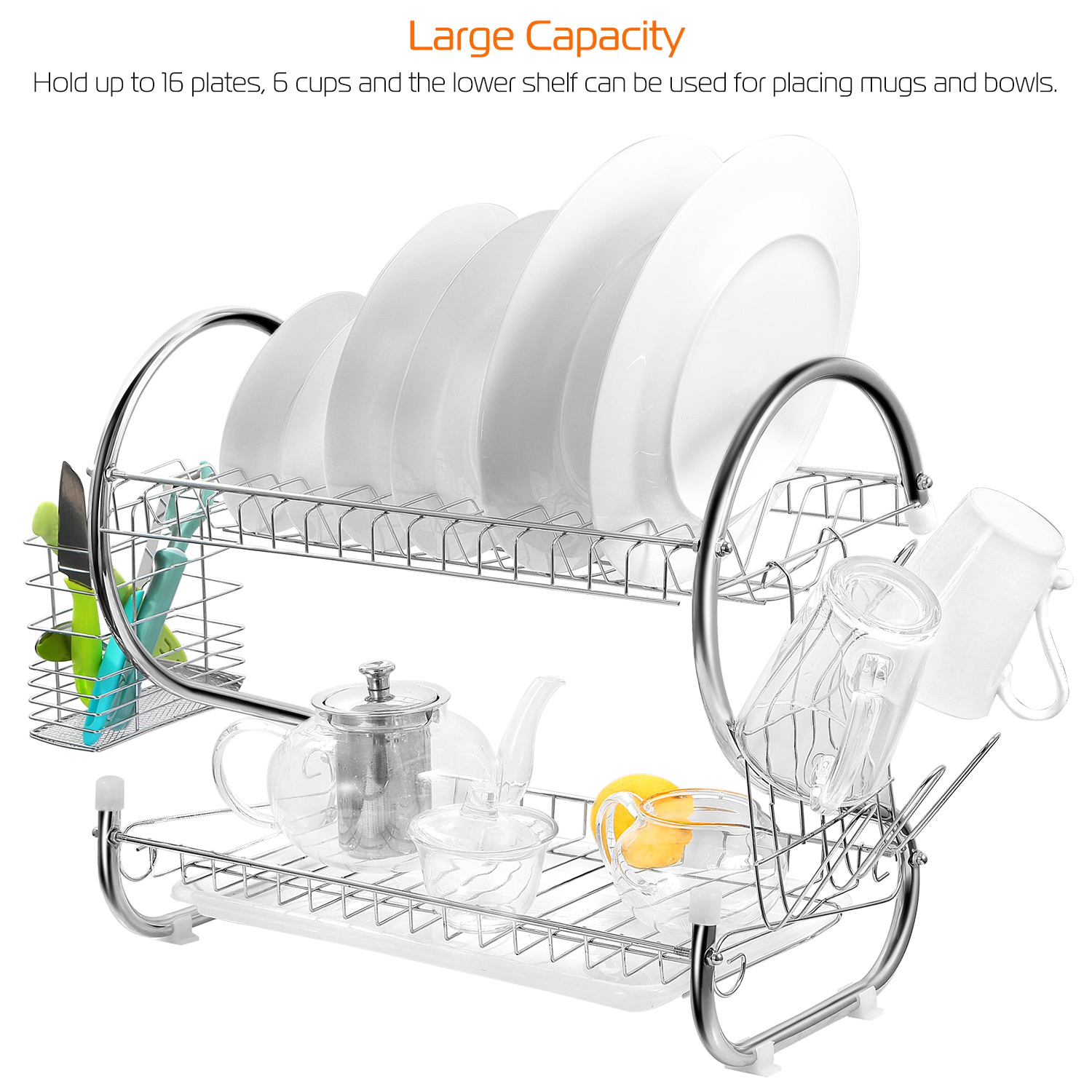 2-Tier Dish Rack Chrome-plated Steel Kitchen Drying Rack w/ Cup Drainer Cutlery Holder Removable Plastic Drainboard