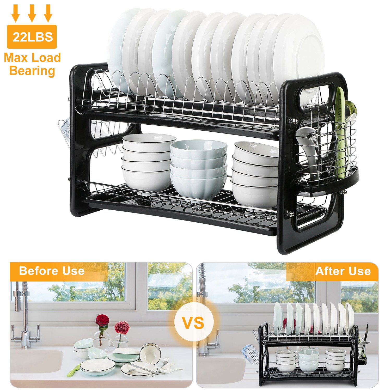 2 Tier Iron Dish Drying Rack Drainboard Set with Large Storage Anti-Rust Dish Drainer Shelf Tableware Holder Cup Holder For Kitchen Counter Storage