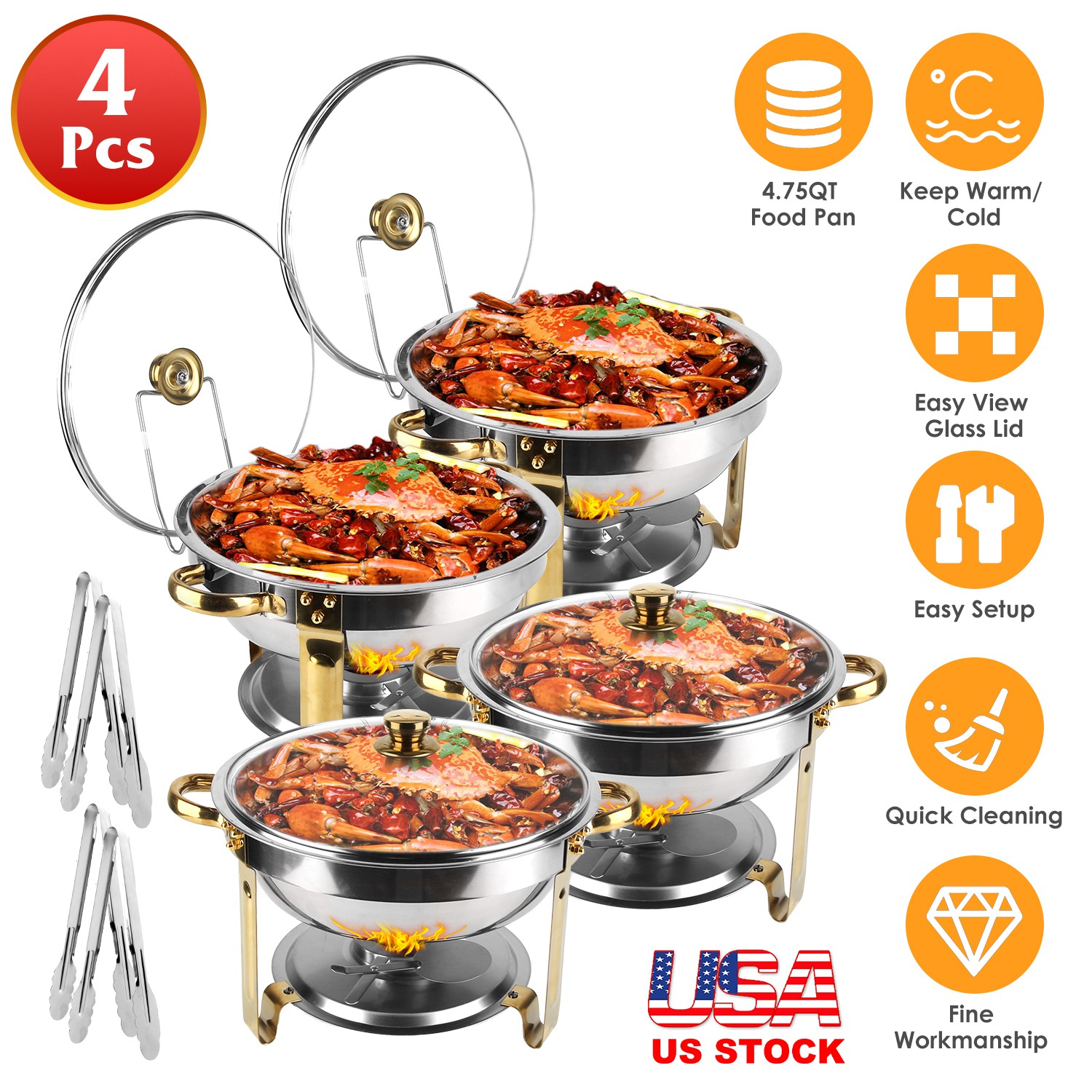 Our chafing dishes set of 4 is great to maintain the temperature and original deliciousness of all your favorite foods no matter hot food or cold fruits. Each food pan features 4.76QT capacity, able to serve at least 5 people, making it ideal for gatherings and events. The transparent glass lid allows you to view the food more conveniently and the vent hole can preserve the freshness of the food. Smooth 201 stainless steel material ensures no hurt to your hands and quick cleaning. Triangle frame design enhances the stability and prevents tipping over. Besides, considerate side handles make mobility more convenient. Easy to set up within 10mins. Perfect for small party, family dinner, or a large live restaurant, buffet, catering, school and corporate events, parties, hotels, weddings, etc..