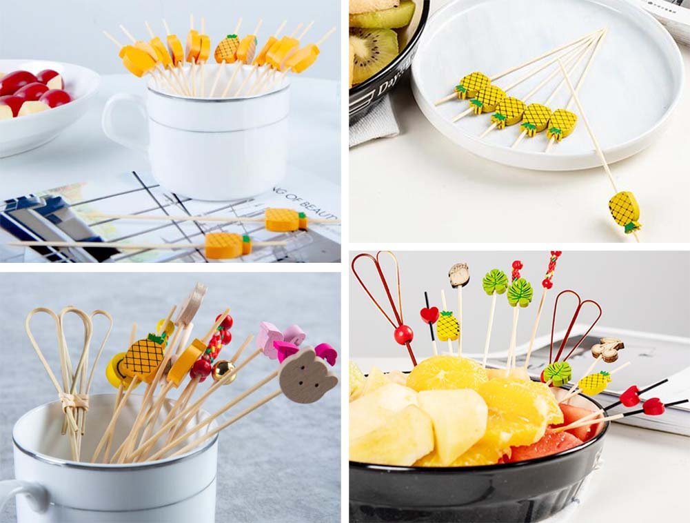 These fancy cocktail picks are designed with colorful and adorable toppers, which will add style to your parties and events. The long toothpicks are made of bamboo, the surface is smooth with no burr, which is easy and safe to use. These decorative bamboo sticks can be applied to cocktail, juice, fruit, dessert, sandwich, salad, cake, appetizers and skewer. They are widely used in party, wedding, holiday, buffet, barbecue, bar, beach or pool party, and daily use.