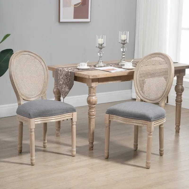 These Chic French Style Set of 2 Vintage Upholstered Armless Rattan Back Dining Chairs Beige White has an elegant and rustic style, gracefully curved back, classic color scheme, and beautifully carved leg patterns. These armless chairs have a rubberwood frame and legs, and linen fabric upholstery with a high-density sponge makes these modern dining chairs breathable and provides high comfort. The padded backrest supports your back and lumbar, while the armless design allows for multiple sitting options and freedom of movement while seated. These dining set chairs work great in your dining room, kitchen, or living room. The footpads on each leg ensure you won't scuff up your hardwood or tile floors and stay in place on the carpet.