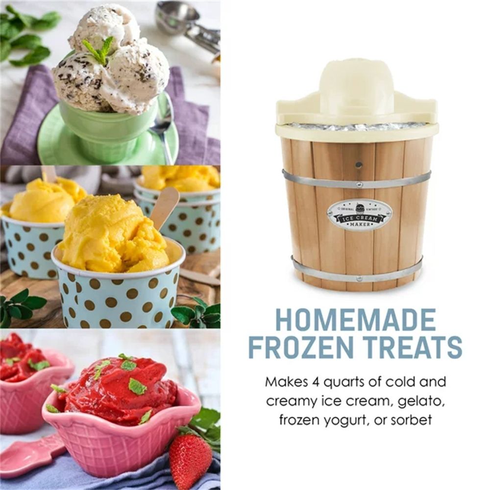 The 4Qt. Old Fashioned Electric Ice Cream Maker churns out delicious homemade ice cream in less than 40 minutes. It features a 4-quart heavy duty aluminum canister and a powerful 90-rpm motor; so making ice cream is fast; convenient and fun for the whole family! It’s great for entertaining at family parties; BBQ’s and picnics using all of your favorite ice cream; sorbet; gelato and even frozen yogurt recipes. The motor turns a six-fin paddle that whips air into the ingredients producing a smooth; rich soft serve ice cream. The paddle quickly crushes cookies; fruit; chocolate chips or a variety of other yummy toppings and thoroughly integrates them into the mixture. The old-fashioned pine wood bucket holds ice and rock salt; keeping the canister at the optimal 10°F temperature. All parts conveniently remove for easy cleaning. Makes 4 quarts of cold and creamy ice cream; gelato; frozen yogurt; or sorbet. Hand-crafted solid pine wood bucket. Easy to operate and clean. Great for barbeques; family parties and picnics. Heavy duty aluminum freezing canister. Powerful electric motor-driven paddle to whip creamy consistency. Makes fresh ice cream in just 40 minutes. Motor is equipped with over-heat protection.