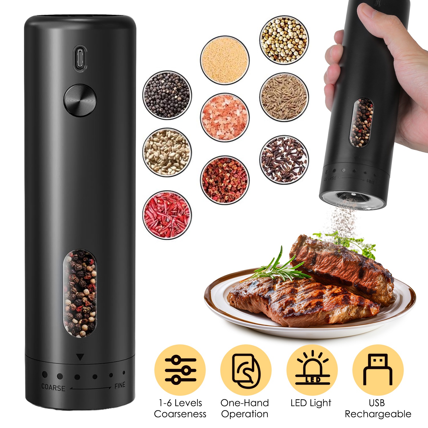 Home > Electric Pepper Grinder USB Rechargeable Pepper Mill Automatic Salt Grinder with 6 Adjustable Coarseness LED Light 110ML/3.72OZ Container One Hand Ope