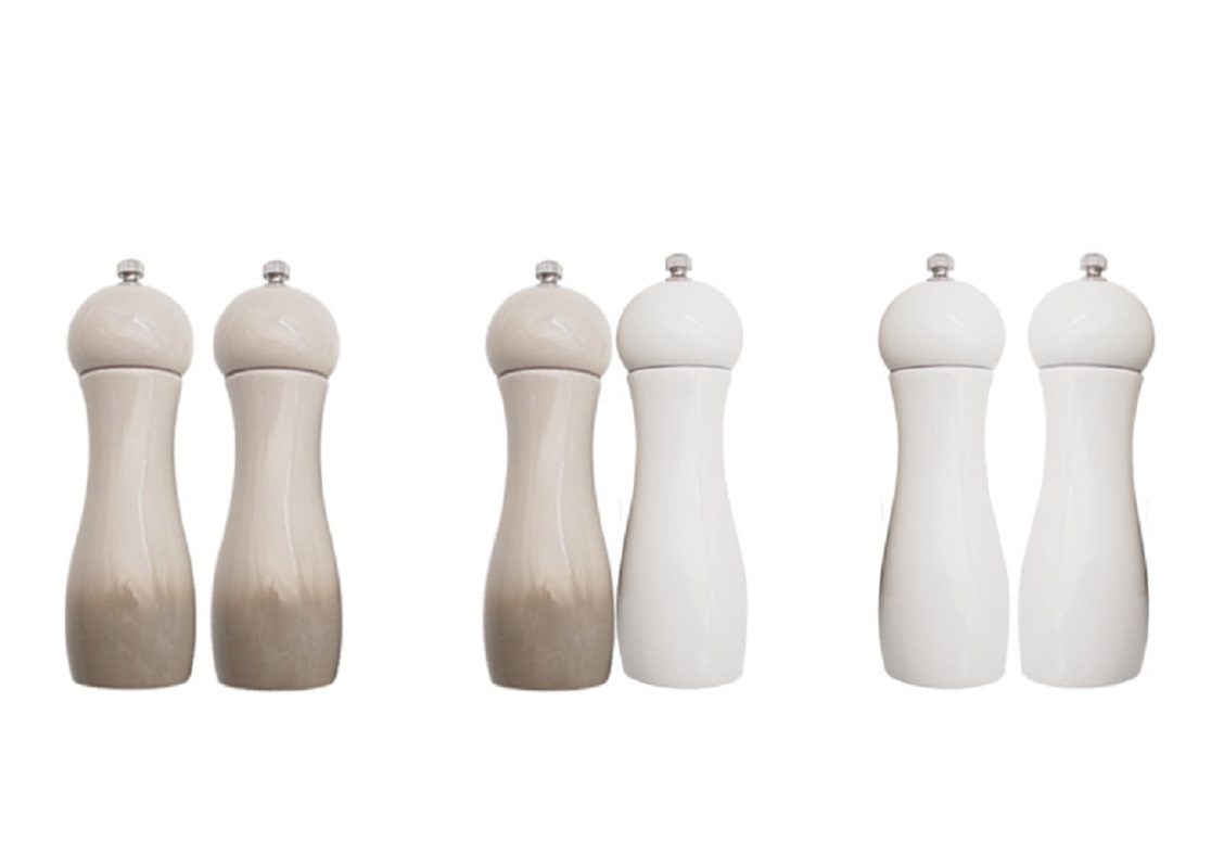 The two different colors of White and Light Grey grinders can be easily identified as the sea salt grinder and pepper mill.